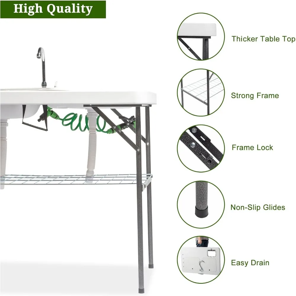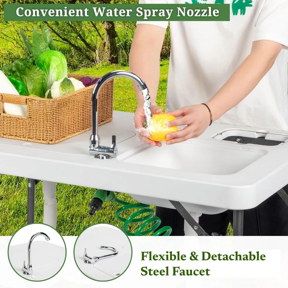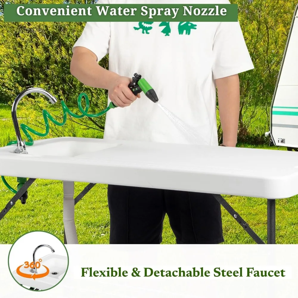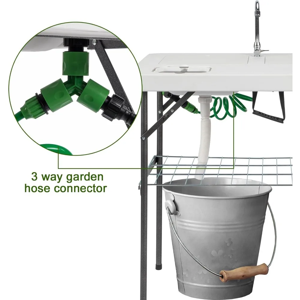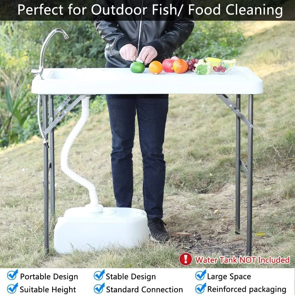 - ✔ MULTI-PURPOSE: Large camping table with faucet operation table and suitable height feature great comfort for various outdoor activities. A 3-way connector to connect the faucet with the spray nozzle and Standard garden connection offers more choices. Ideal for fish or food cutting and cleaning in outdoor camping, hunting or picnic etc.