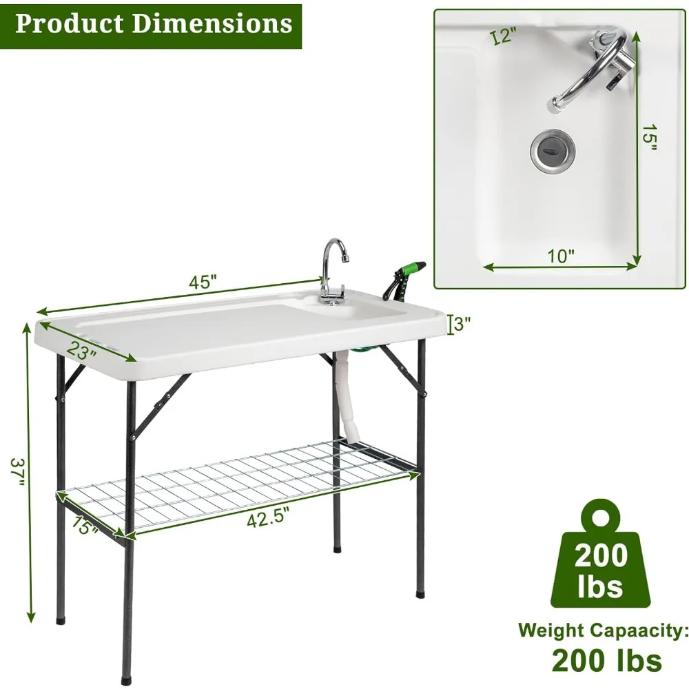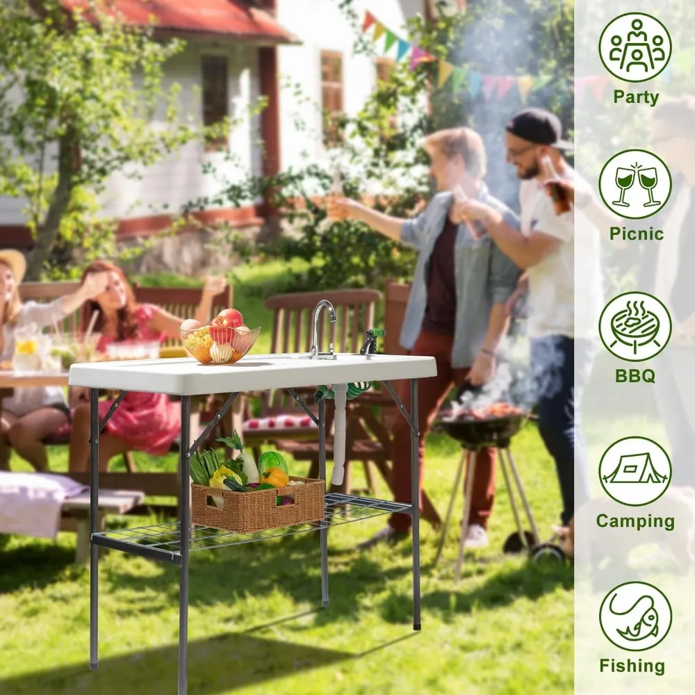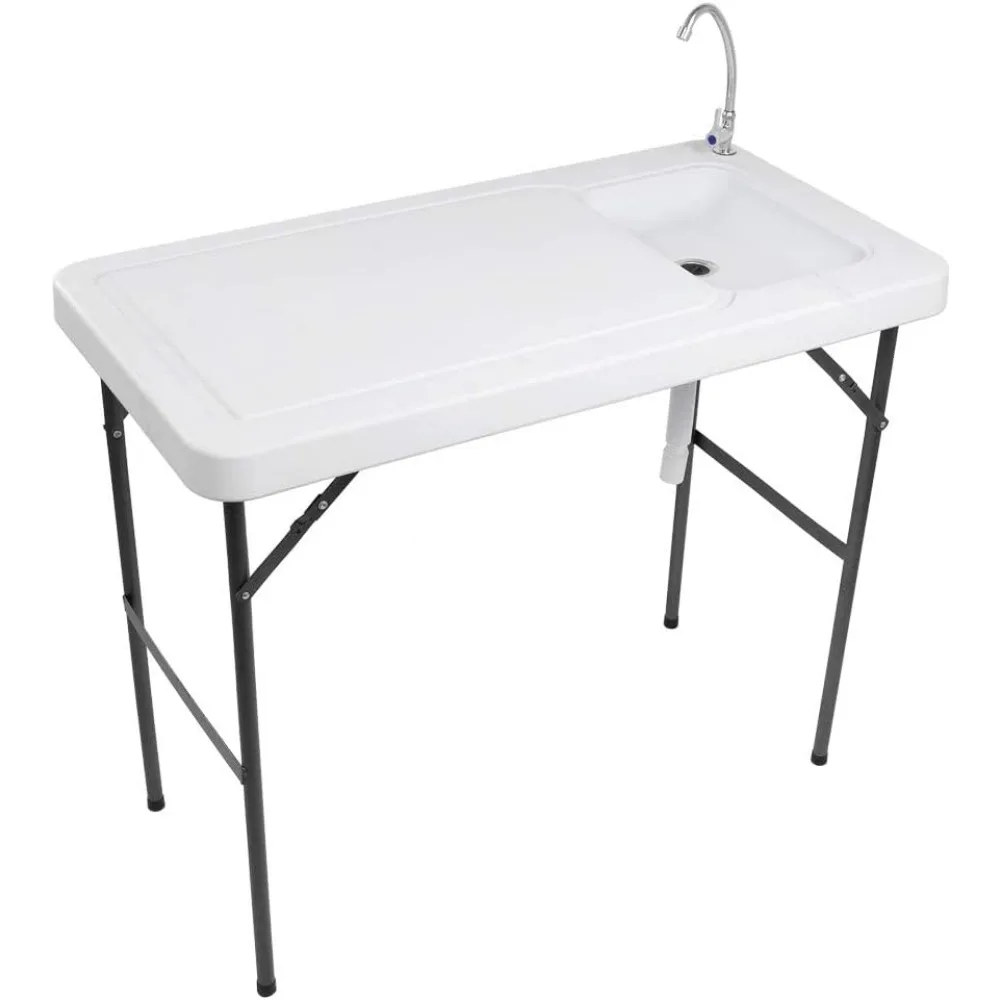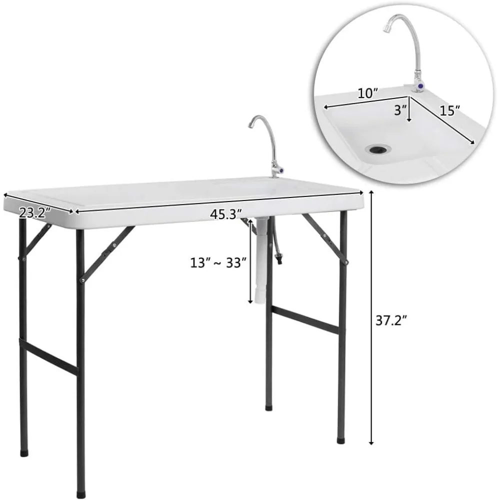 - ✔ MULTI-PURPOSE: Large camping table with faucet operation table and suitable height feature great comfort for various outdoor activities. A 3-way connector to connect the faucet with the spray nozzle and Standard garden connection offers more choices. Ideal for fish or food cutting and cleaning in outdoor camping, hunting or picnic etc.
