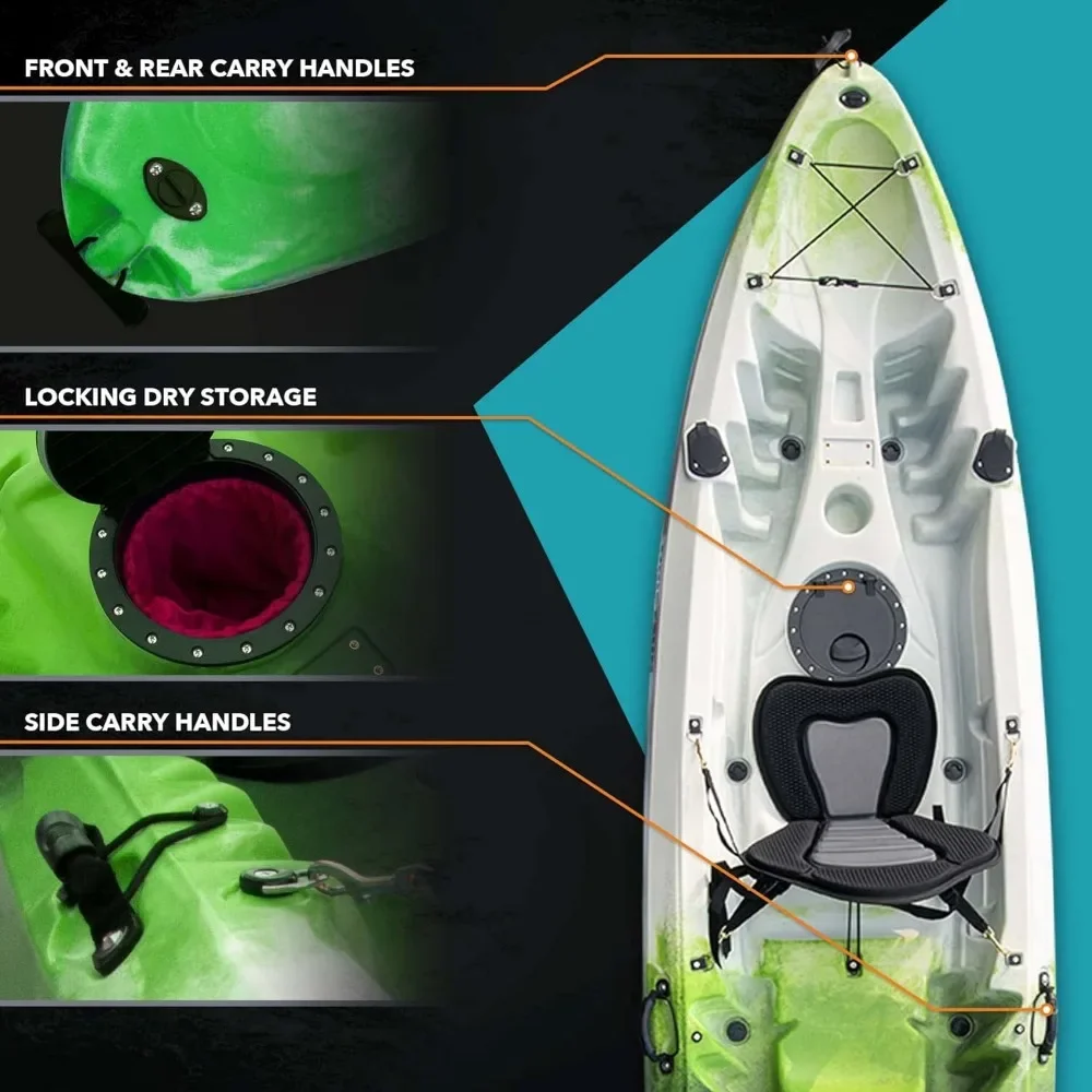 Fully Outfitted – 4 flush mount capped rod holders and 2 mounting points for scotty accessories, rear tankwell storage with bungee, dual watertight storage hatches with inserts and built in cup holders. 4 fixed carry handles for easy transportation, two paddle park holders to secure paddles when not in use, and molded center cockpit seat These kayaks for adults hard shell come with all the accessories.
