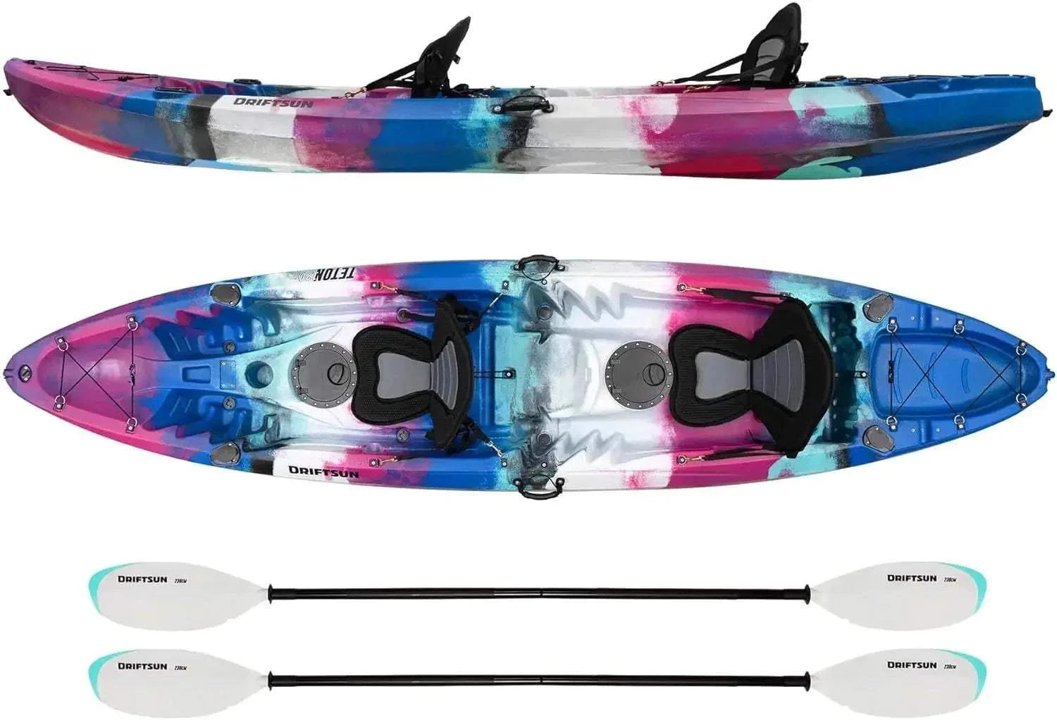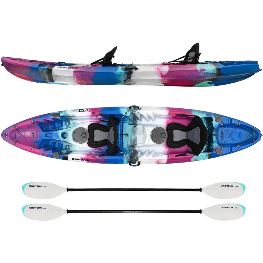 Package Includes – (2) adjustable eva padded seats w/ high back support, (2) anodized aluminum performance kayak paddles with ergonomic grips and (8) scupper plugs for self bailing ports
