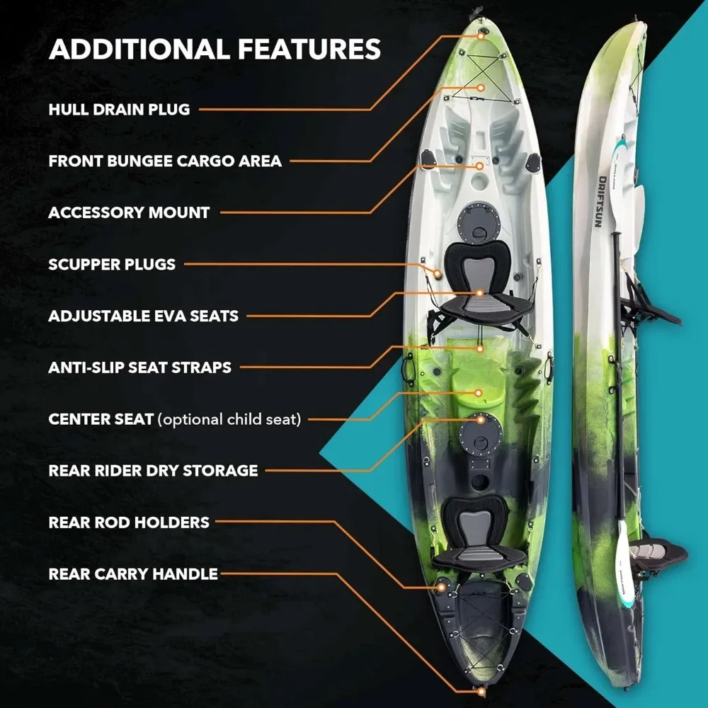 Recreational Tandem Kayak – 12'2ft 2 Person Kayak is perfect for Fishing, Travel, or Family Recreation - 500 pound weight capacity can accommodate two paddlers + center seat for child, dog or solo paddling.